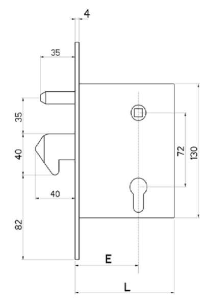 Frontale: zincato catenaccio prolungato con scrocco incorporato ad una mandata da 10mm. richiamo scrocco con chiave o con maniglia